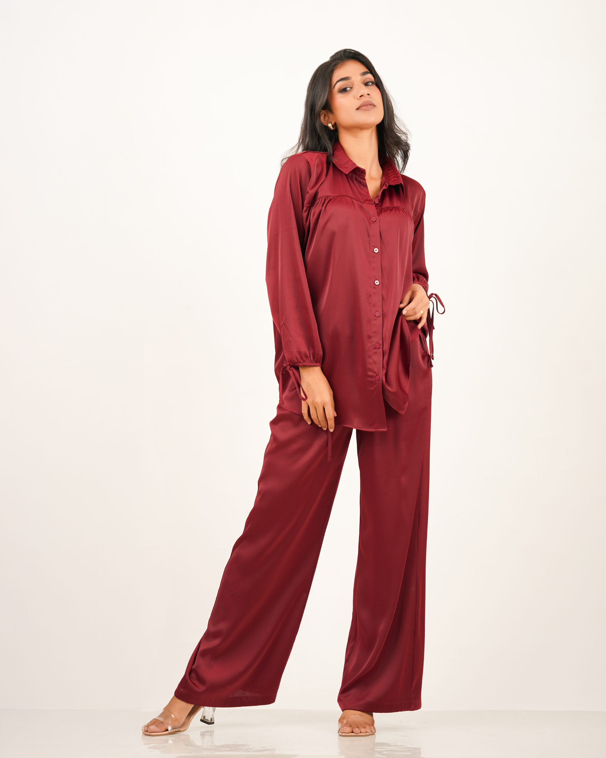 women's clothing consisting of a loose-fitting, long-sleeve button-up shirt and wide-leg trousers