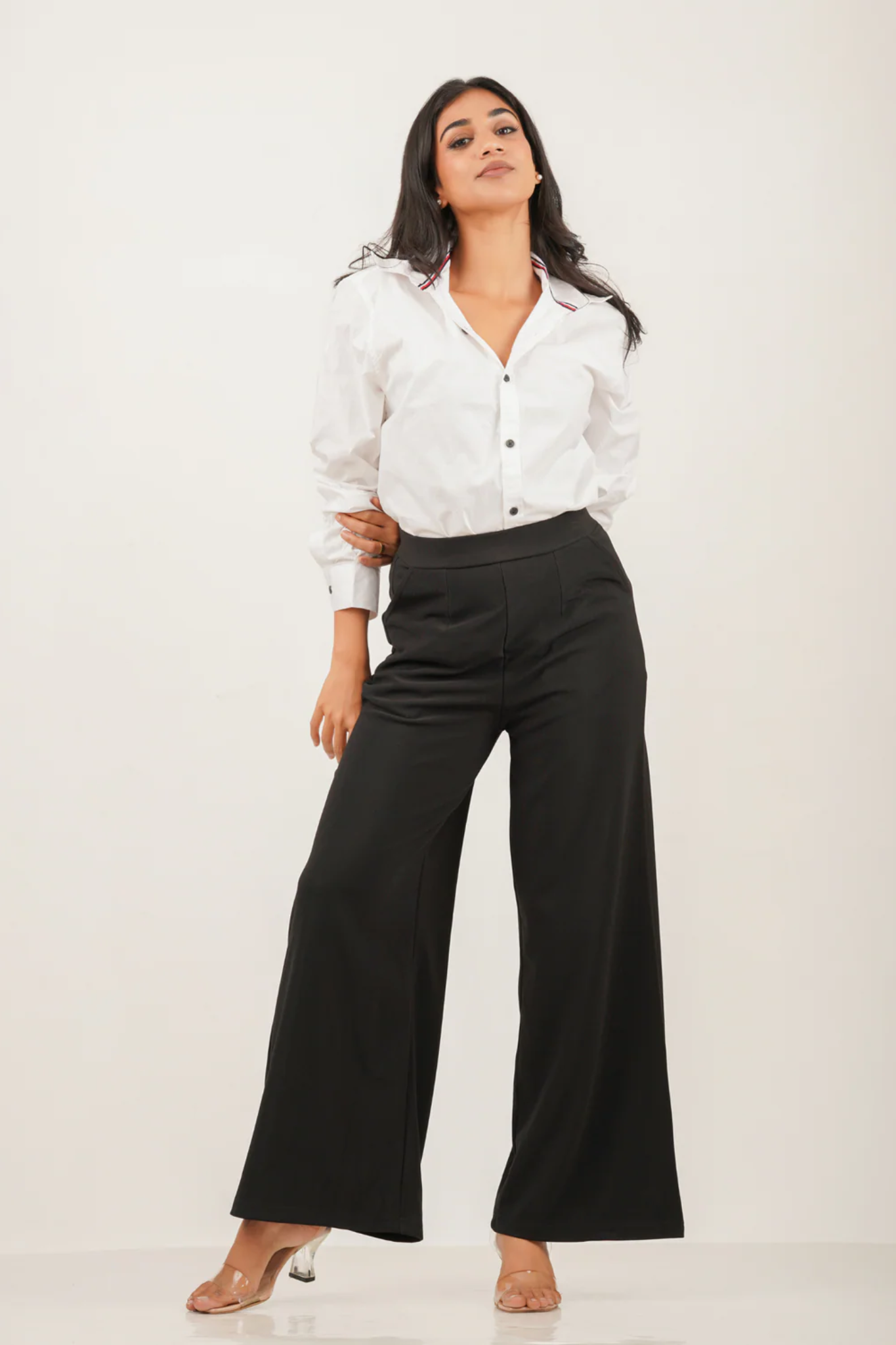 A stylish high-waisted office pant featuring a wide-leg design and stretchable fabric, offering a perfect blend of elegance and comfort for a professional yet relaxed look, ideal for all-day wear in any office setting.